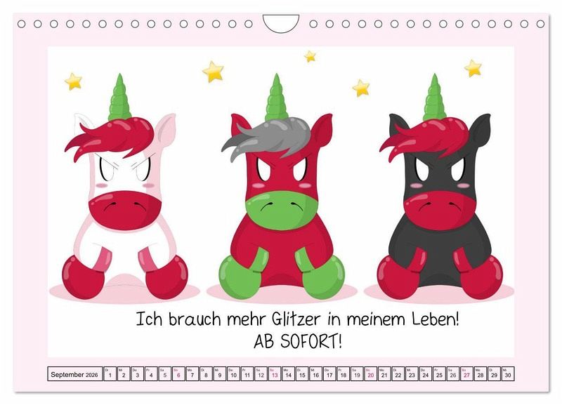Ein niedlicher Typo-Kalender mit Einhorn-Affirmationen und Lebensweisheiten für mehr Lebensfreude und gute Laune. Dieser lustige Kalender bringt positive Schwingungen in das Zuhause und zaubert ein Schmunzeln auf die Gesichter. Absichtlich schlicht gehalten, bietet dieser Kalender auch genügend Platz für Notizen und er eignet sich natürlich als humorvolles Geschenk.