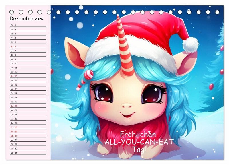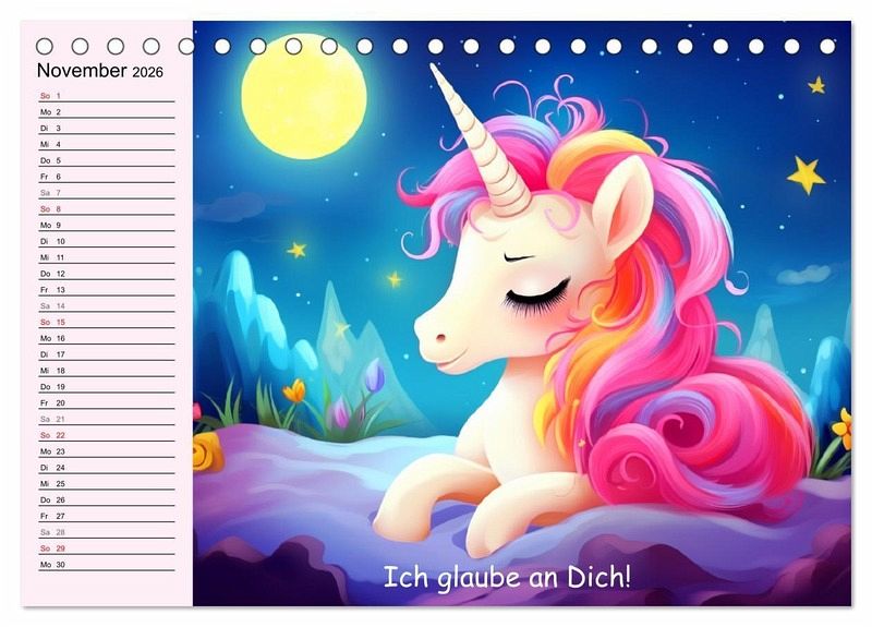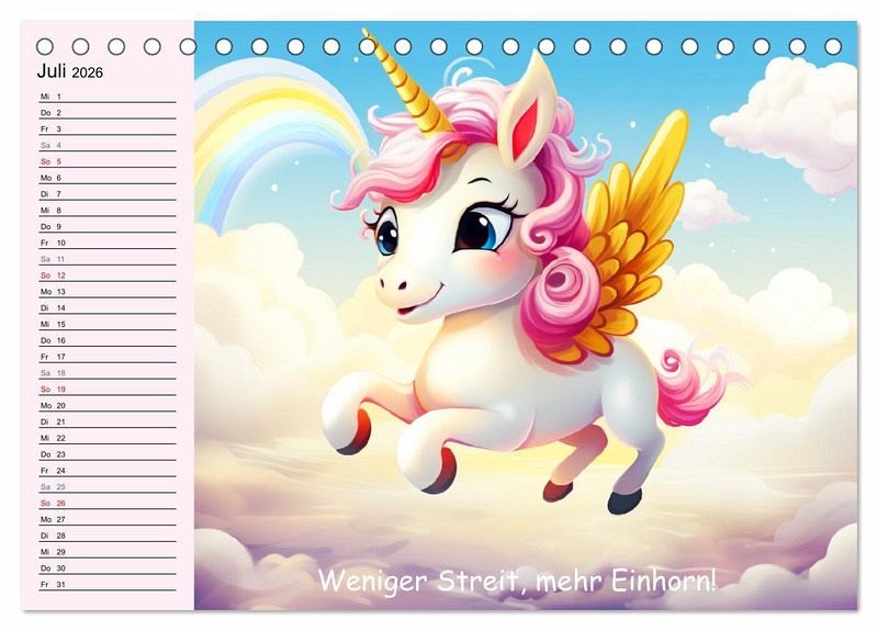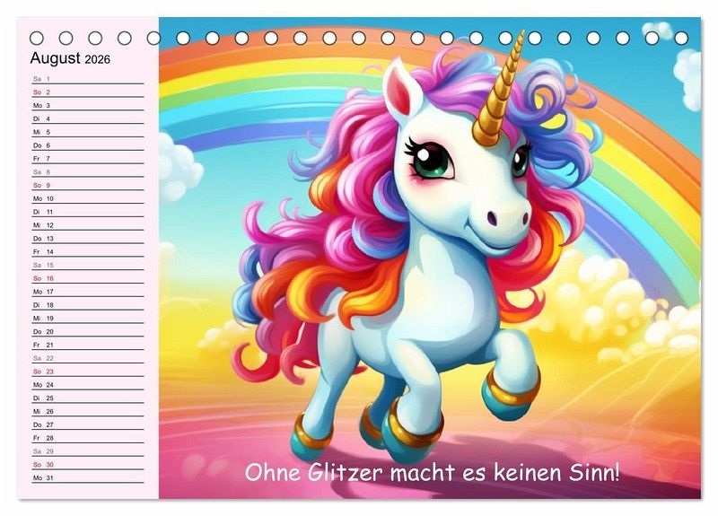 Erlebe magische Einhorn-Momente und tauche ein in eine Welt voller Lächeln und Liebe. Jeder Monat zeigt ein farbenfrohes, niedliches Einhorn und eine lustige Weisheit. Diese Illustrationen wurden mit Hilfe von KI erstellt und bringen Farbe und Freude in jedes Zuhause. Ein perfektes Geschenk für das ganze Jahr!