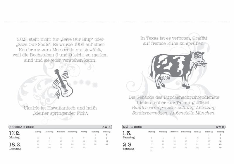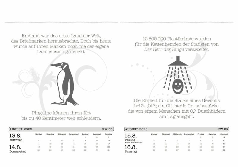 In den Trevi-Brunnen in Rom werden täglich 4.000 Euro geworfen und Flamingos sind rosa, weil sie rosafarbene Krebse essen: Erstaunliche Fakten, häppchenweise präsentiert, sind ideale und garantiert unbedenkliche Brain Booster. Sie erweitern den Wissenshorizont, liefern Gesprächsstoff und bieten beste Unterhaltung - Tag für Tag.