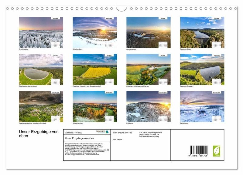 QUALITÄT - Hochwertiger Fotokalender mit 12 wunderschönen Motiven auf lichtbeständigem Bilderdruckpapier, robuste Spiralbindung mit Aufhängebügel.NACHHALTIG - deutliche Abfallreduzierung durch bedarfsgerechte Einzelstückfertigung, umweltfreundliches FSC-zertifiziertes Papier, Produktion in Deutschland, klimabewusste Logistik.PERFEKTES GESCHENK - Kalender für Freunde und Familie, für Kinder und Erwachsene, jung und alt, zu Weihnachten, Geburtstag oder zwischendurch.VIELFALT - Bildkalender in verschiedenen Formaten, z.B. DIN A5, DIN A4, DIN A3 sowie DIN A2. Ob Naturmotiv, Gemälde oder Fotos, ideal für ein persönliches Wohlfühlambiente.Das Erzgebirge aus der Vogelperspektive. von Autor(in): Sven Wagner