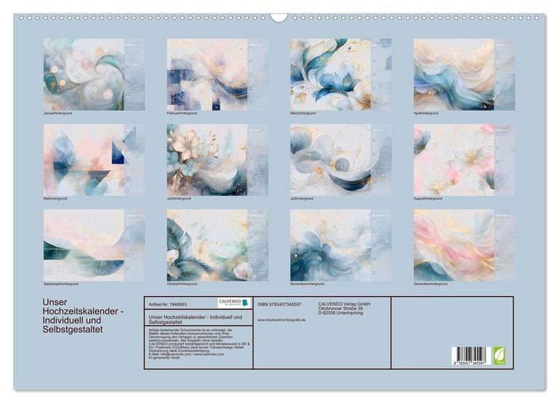 Dieser neue Hochzeitskalender mit eleganten, KI-generierten Hintergründen zum Selbstgestalten bietet Paaren oder ihren Freunden, die Möglichkeit, die schönsten Momente stilvoll zu präsentieren. Jeder Monat wird durch kunstvoll gestaltete Hintergründe hervorgehoben, die individuell angepasst werden können. Dieser Kalender vereint persönliche Erinnerungen mit modernster Ki Technologie und schafft ein einzigartiges, romantisches Andenken an das ganze Hochzeitsjahr. Erstellt von der Fotografin drachenkind-fotografie.