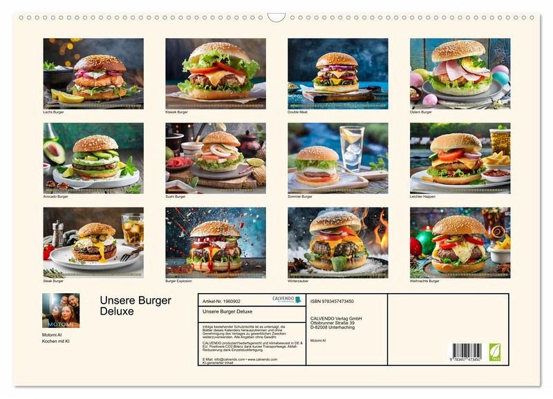 Entdecken Sie den ultimativen Genusskalender: "Unser Deluxe Burger " Kalender präsentiert jeden Monat eine neue kulinarische Offenbarung - von klassischen Cheeseburgern bis hin zu exotischen Kreationen. Doch das Besondere: Jedes Burgerkunstwerk wurde von unserer KI mit höchster Präzision und Kreativität kreiert. Tauchen Sie ein in eine Welt sinnlicher Aromen und visueller Faszination, wo jede Seite Ihren Gaumen und Ihre Augen gleichermaßen verwöhnt. Bestellen Sie jetzt und erleben Sie ein Jahr voller burgerlicher Höhepunkte!