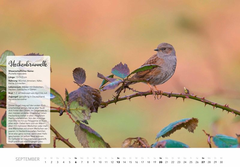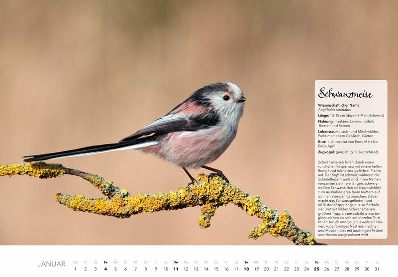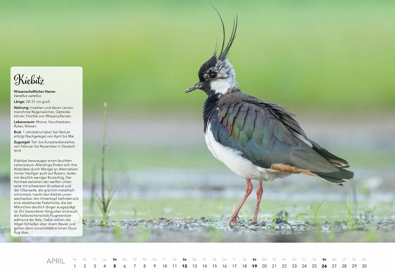 12 farbenprächtige Bilder zeigen die wunderschöne Vogelvielfalt unserer heimischen Gärten. Für alle, die gerne mehr über die bunten, zwitschernden Gesellen am Vogelhäuschen wissen wollen, befinden sich auf jedem Kalenderblett kurze informative Texte zu den Tieren. Vogelbestimmung ist auch mit diesem wunderschönen und informativen Kalender möglich! 14 Seiten Kunstdruckpapier, Cover mit Glanzlack veredelt, stabile Rückwand, Silberne Spiralbindung und Wandplaner für einen Jahresüberblick.