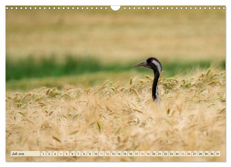 Juli: Kranich (Grus grus) spaziert durchs Kornfeld.