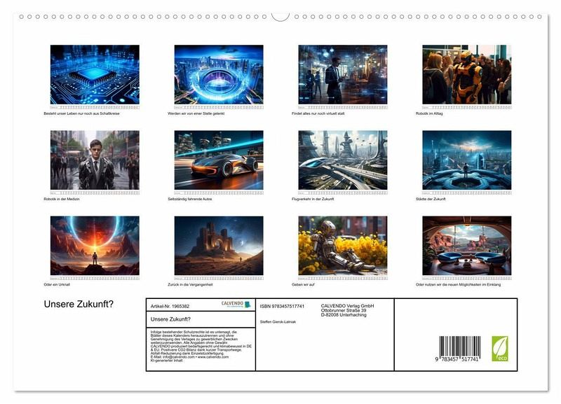 Willkommen in der Zukunft! Hier erwartet sie ein innovatives und fortschrittliches Leben, das von modernster Technologie und Nachhaltigkeit geprägt ist. Der Künstler Steffen Gierig Latinistik hat das Thema beleuchtet und möchte mit diesem Kalender zum nachdenken anregen. In wie weit wir unser Leben selbst bestimmen. Diese Bilder sind mir einer KI und digitalen Bildbearbeitungsprogrammen generiert worden.