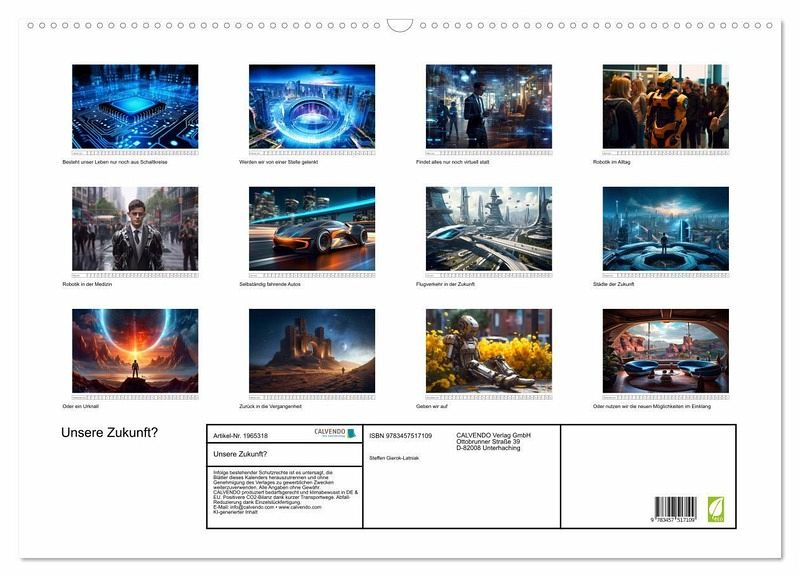 Willkommen in der Zukunft! Hier erwartet sie ein innovatives und fortschrittliches Leben, das von modernster Technologie und Nachhaltigkeit geprägt ist. Der Künstler Steffen Gierig Latinistik hat das Thema beleuchtet und möchte mit diesem Kalender zum nachdenken anregen. In wie weit wir unser Leben selbst bestimmen. Diese Bilder sind mir einer KI und digitalen Bildbearbeitungsprogrammen generiert worden.