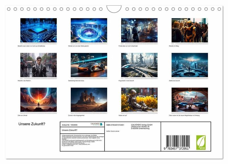 Willkommen in der Zukunft! Hier erwartet sie ein innovatives und fortschrittliches Leben, das von modernster Technologie und Nachhaltigkeit geprägt ist. Der Künstler Steffen Gierig Latinistik hat das Thema beleuchtet und möchte mit diesem Kalender zum nachdenken anregen. In wie weit wir unser Leben selbst bestimmen. Diese Bilder sind mir einer KI und digitalen Bildbearbeitungsprogrammen generiert worden.