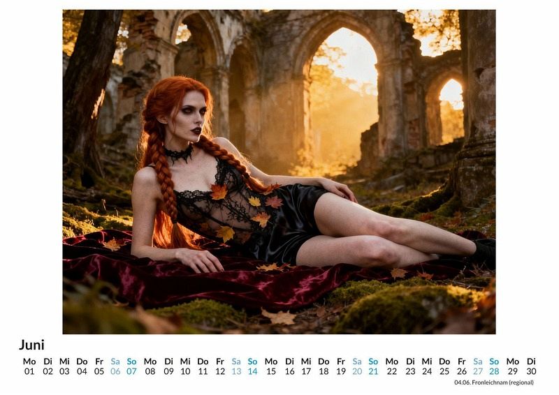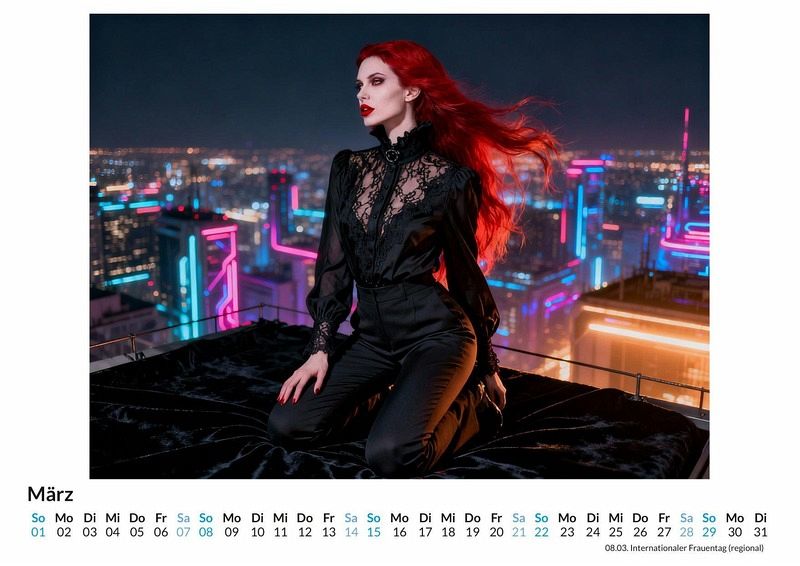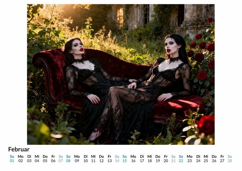 Die Nacht birgt Geheimnisse, die älter sind als die Zeit. In ihren Schatten lauern Wesen von unsterblicher Schönheit und unstillbarem Durst. Der Kalender "Unsterbliche Vampirinnen" öffnet ein Fenster in eine Welt, die von Dunkelheit und Verführung regiert wird. Dieser Kalender ist eine passende Wahl für: * Liebhaber der Gothic Kultur und dunkler Ästhetik. * Sammler von Fantasy Motiven mit einem Hauch von Erotik. * Menschen, die eine düstere und geheimnisvolle Atmosphäre schätzen. Zwölf Motive führen durch das Jahr, jedes eine Hommage an die ewige Nacht. Verführerische Vampirinnen, gekleidet in durchsichtige schwarze Spitze, ruhen auf weichem Samt. Ihre Lippen, rot wie frisches Blut, erzählen Geschichten von Verlangen und Unsterblichkeit. Jedes einzelne Bild ist das Ergebnis komplexer Algorithmen, die eine düstere Vision zum Leben erweckt haben. Die Szenen fangen die Essenz der unsterblichen Jägerinnen in Momenten stiller Macht ein. Der Kauf dieses Kalenders beinhaltet: * Zwölf Monatsblätter mit einzigartigen Vampirmotiven. * Ein übersichtliches Kalendarium für die Jahresplanung. * Einen Wandkalender, der Blicke auf sich zieht. Der Kalender "Unsterbliche Vampirinnen" ist mehr als nur ein Zeitmesser. Er ist ein Begleiter durch ein Jahr voller dunkler Eleganz und geheimnisvoller Anziehungskraft. Ein Blick auf die zwölf Gesichter der Nacht offenbart ihre unvergängliche Präsenz.