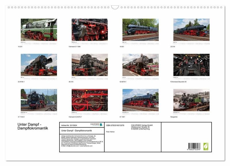 Noch bis in die 70er Jahre waren Eisenbahnwelten ohne Dampfloks mit all ihren Begleiterscheinungen wie Dampf-, Rauch- und Geräuschentwicklung undenkbar. Mit den Bildern betriebsfähiger Dampflokomotiven in Deutschland lässt dieser Kalender diese Ära wieder aufleben.