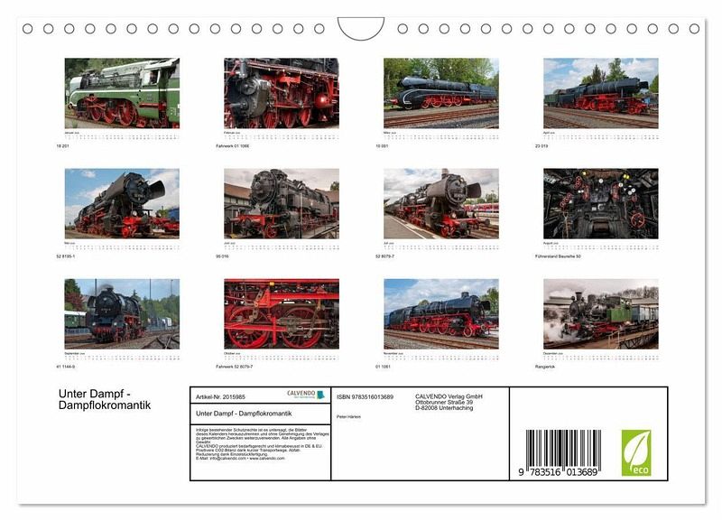 Noch bis in die 70er Jahre waren Eisenbahnwelten ohne Dampfloks mit all ihren Begleiterscheinungen wie Dampf-, Rauch- und Geräuschentwicklung undenkbar. Mit den Bildern betriebsfähiger Dampflokomotiven in Deutschland lässt dieser Kalender diese Ära wieder aufleben.