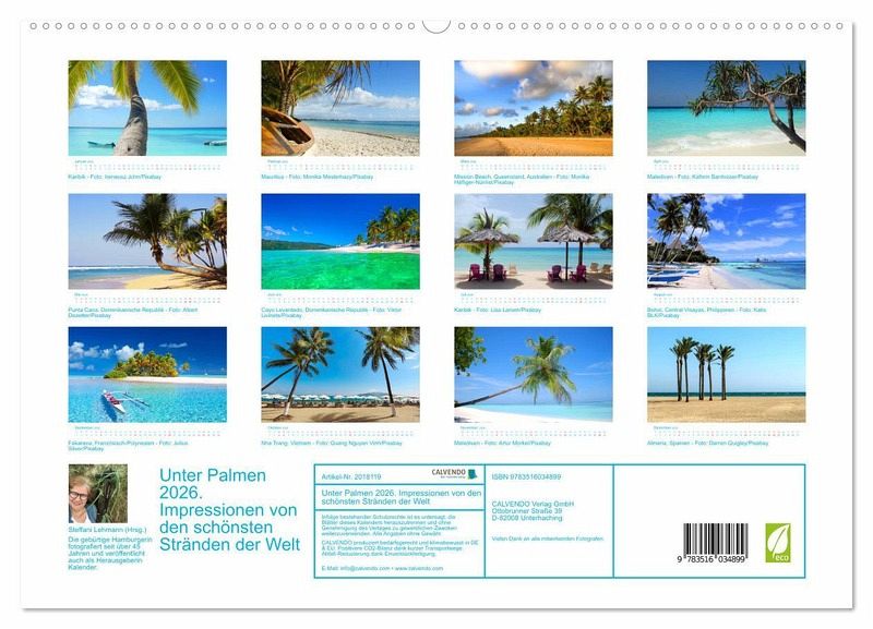 PREMIUM-LINIE - Brillanter Fotokalender mit 12 wunderschönen Motiven, Kunstdruck in Hochglanz in Museumsqualität.QUALITÄT - edle Materialien, stabile Rückwand mit 2 innovativen Einstecktaschen für eine optimale Präsentation an der Wand.NACHHALTIG - deutliche Abfallreduzierung durch bedarfsgerechte Einzelstückfertigung, umweltfreundliches FSC-zertifiziertes Papier, Produktion in Deutschland, klimabewusste Logistik.PERFEKTES GESCHENK - Kalender für Freunde und Familie, für Kinder und Erwachsene, jung und alt, zu Weihnachten, Geburtstag oder zwischendurch.12 schwelgerische Fotos von Sonne, Strand und Meer unter Palmen. von Autor(in): Steffani Lehmann