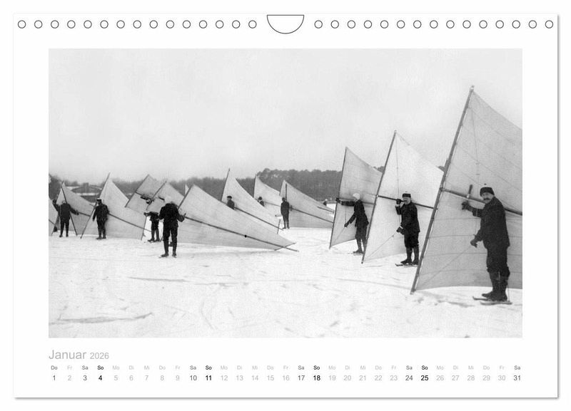 Januar: Wettlauf mit Handsegel auf einem See bei Berlin, um 1900
