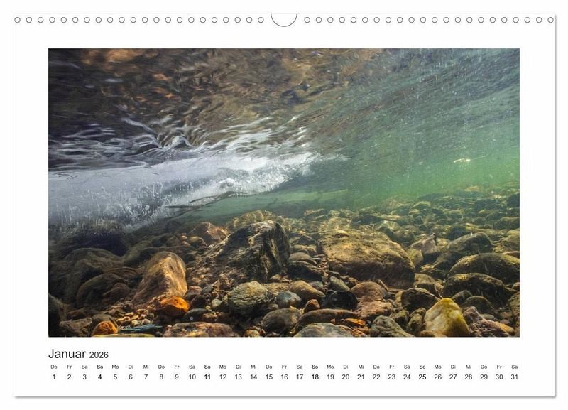 Erleben Sie in außergewöhnlichen Perspektiven die faszinierende Unterwasserwelt heimischer Bäche und Flüsse. Gezeigt wird diese in 13 Aufnahmen direkt unter der Wasseroberfläche oder als Kombination von Über- und Unterwasserwelt. Mal wild und dynamisch, dann wieder still und mystisch lichtdurchflutet oder erstarrt zu Eis, entführt Sie dieser Kalender in eine Welt zwischen den Elementen.