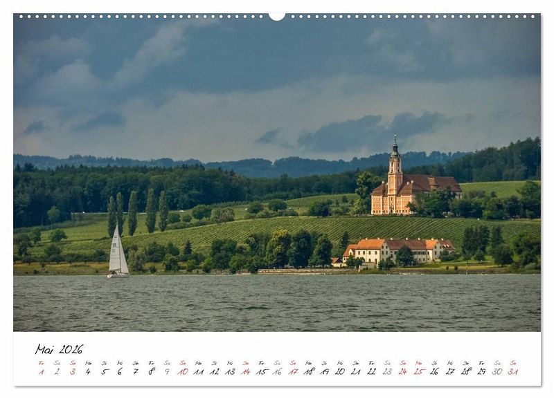 Mai: Blick vom Bodensee auf die Klosterkirche Birnau