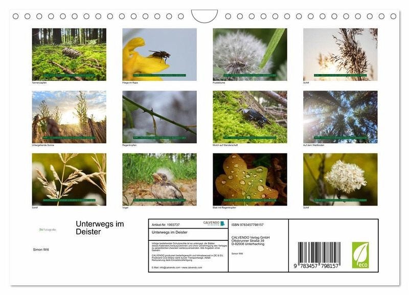 QUALITÄT - Hochwertiger Fotokalender mit 12 wunderschönen Motiven auf lichtbeständigem Bilderdruckpapier, robuste Spiralbindung mit Aufhängebügel.NACHHALTIG - deutliche Abfallreduzierung durch bedarfsgerechte Einzelstückfertigung, umweltfreundliches FSC-zertifiziertes Papier, Produktion in Deutschland, klimabewusste Logistik.PERFEKTES GESCHENK - Kalender für Freunde und Familie, für Kinder und Erwachsene, jung und alt, zu Weihnachten, Geburtstag oder zwischendurch.VIELFALT - Bildkalender in verschiedenen Formaten, z.B. DIN A5, DIN A4, DIN A3 sowie DIN A2. Ob Naturmotiv, Gemälde oder Fotos, ideal für ein persönliches Wohlfühlambiente.Ein kleiner Streifzug durch die Natur. von Autor(in): Simon Witt