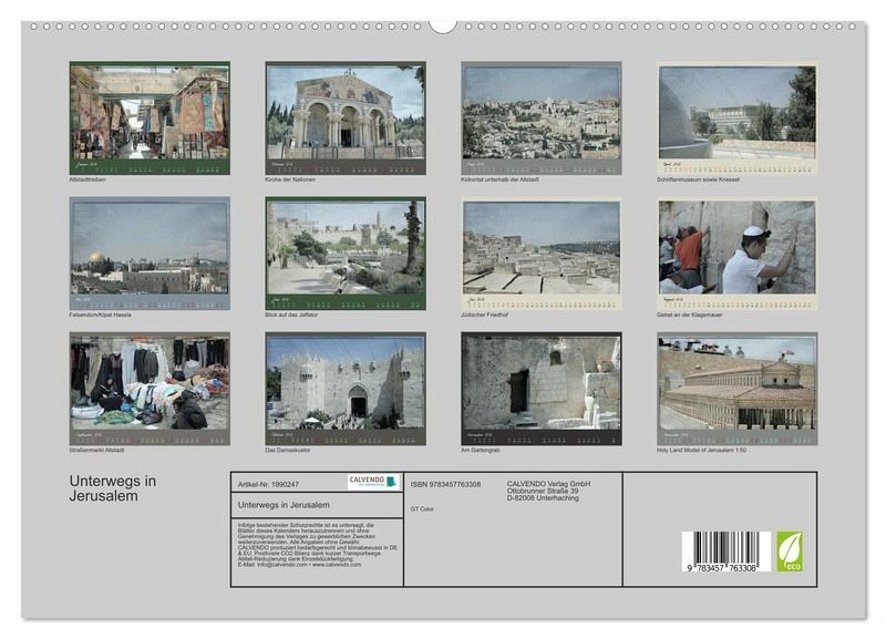 Einige Blickwinkel einer Stadt, welche wohl kaum mehr Historie, Gegenwart aber vor allem auch Zukunft gebündelt bieten kann. Eine kleine Auswahl einer großen Fülle von interessanten Orten, die erlebt und erforscht werden möchten, werden hier in Impressionen vorgestellt. Jerusalem ist eine Reise wert. Dieser Kalender möchte ein kleiner Anstoß dazu sein.