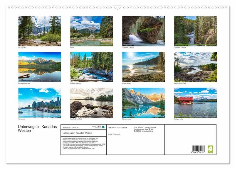 QUALITÄT - Hochwertiger Fotokalender mit 12 wunderschönen Motiven auf lichtbeständigem Bilderdruckpapier, robuste Spiralbindung mit Aufhängebügel.NACHHALTIG - deutliche Abfallreduzierung durch bedarfsgerechte Einzelstückfertigung, umweltfreundliches FSC-zertifiziertes Papier, Produktion in Deutschland, klimabewusste Logistik.PERFEKTES GESCHENK - Kalender für Freunde und Familie, für Kinder und Erwachsene, jung und alt, zu Weihnachten, Geburtstag oder zwischendurch.VIELFALT - Bildkalender in verschiedenen Formaten, z.B. DIN A5, DIN A4, DIN A3 sowie DIN A2. Ob Naturmotiv, Gemälde oder Fotos, ideal für ein persönliches Wohlfühlambiente.Die Bilderreise führt sie durch die wunderschöne Natur der Berge in Kanadas Westen bis hin zur malerischen Küste von Autor(in): Lukas Proszowski