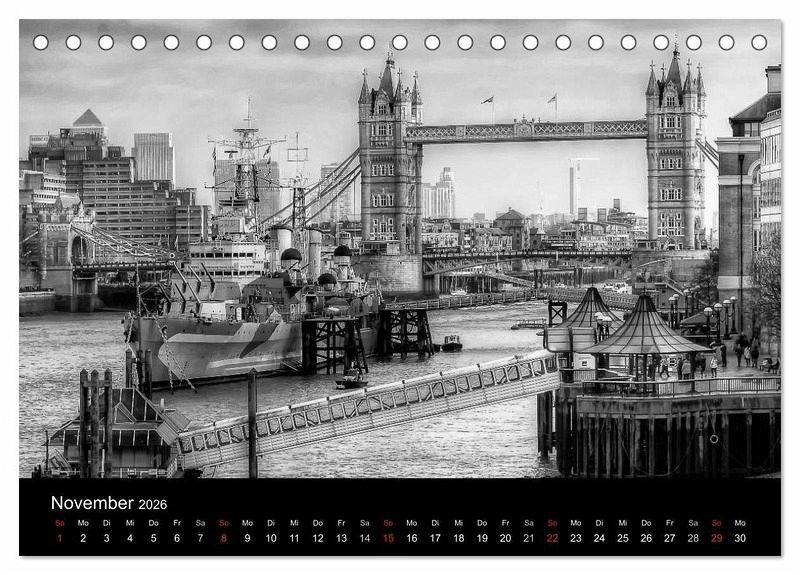 Klassische schwarz-weiß Aufnahmen bieten dem Betrachter einen Blick in die Metropole London. Erfreuen Sie sich an Sehenswürdigkeiten wie der Tower Bridge oder dem London Eye. Aber auch an einem Blick auf die alltäglichen Dinge, die das Stadtbild prägen.