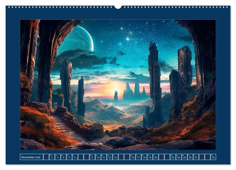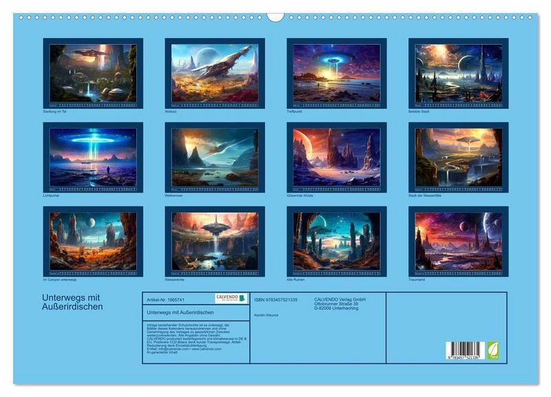 Dieser Kalender bietet Stoff zum Träumen für jeden Science Fiction Fan. Wie könnten sie aussehen, die fremden Welten? Könnte man dort Urlaub machen? Vielleicht fällt dem einen oder anderen Betrachter auch eine Geschichte dazu ein? Die möglichen Welten "dort oben" haben uns schon immer fasziniert. Mit diesem Kalender können Sie 12 Monate lang träumen, wie es wäre, dorthin reisen zu können. Die Bilder wurden erstellt mit Fantasie, Kreativität, künstlicher Intelligenz und Photoshop.
