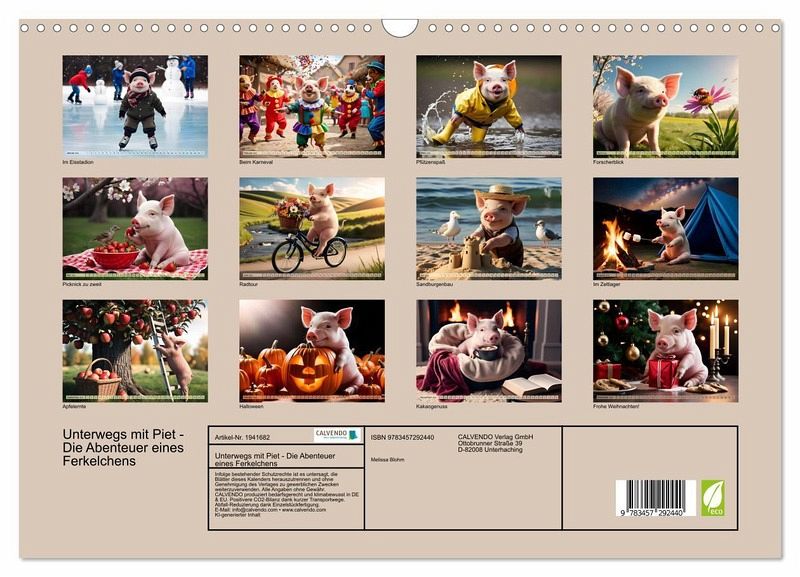Begleite Ferkelchen Piet auf seiner Reise durch das Jahr voller lustiger Abenteuer! Ob Schlittschuhlaufen, Picknicken, oder ein Strandtag - Piet erlebt jeden Monat etwas Neues und Spannendes. Dieser kindgerechte Kalender mit liebevollen, KI-generierten Bildern sorgt für Freude und Spaß bei Groß und Klein. Perfekt für Kinder und alle, die Tiere lieben!