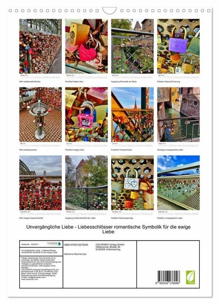 QUALITÄT - Hochwertiger Fotokalender mit 12 wunderschönen Motiven auf lichtbeständigem Bilderdruckpapier, robuste Spiralbindung mit Aufhängebügel.NACHHALTIG - deutliche Abfallreduzierung durch bedarfsgerechte Einzelstückfertigung, umweltfreundliches FSC-zertifiziertes Papier, Produktion in Deutschland, klimabewusste Logistik.PERFEKTES GESCHENK - Kalender für Freunde und Familie, für Kinder und Erwachsene, jung und alt, zu Weihnachten, Geburtstag oder zwischendurch.VIELFALT - Bildkalender in verschiedenen Formaten, z.B. DIN A5, DIN A4, DIN A3 sowie DIN A2. Ob Naturmotiv, Gemälde oder Fotos, ideal für ein persönliches Wohlfühlambiente.Ein Liebesschloss ist die zeitlose Schönheit und romantische Symbolik für die ewige Liebe von Autor(in): Katharina Stachanczyk