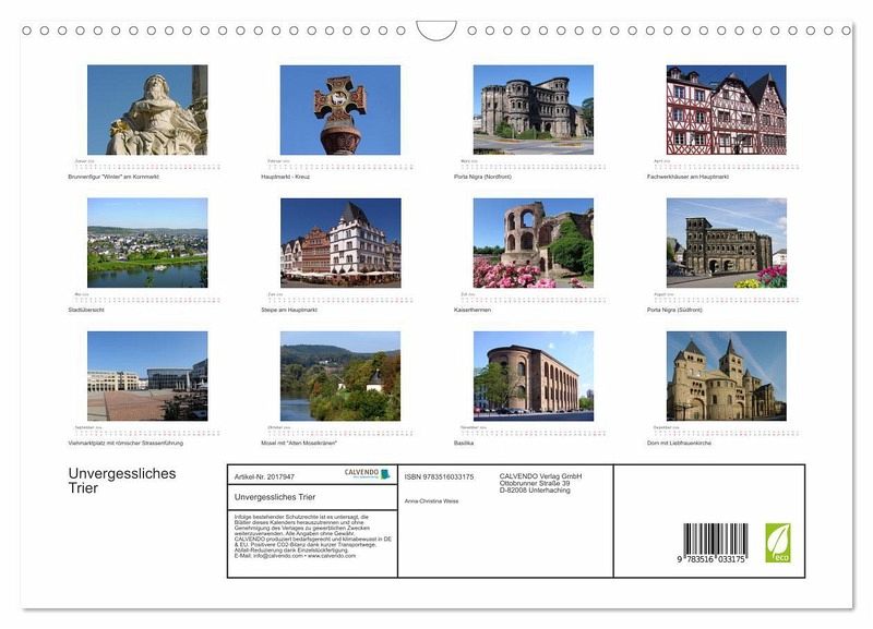 QUALITÄT - Hochwertiger Fotokalender mit 12 wunderschönen Motiven auf lichtbeständigem Bilderdruckpapier, robuste Spiralbindung mit Aufhängebügel.NACHHALTIG - deutliche Abfallreduzierung durch bedarfsgerechte Einzelstückfertigung, umweltfreundliches FSC-zertifiziertes Papier, Produktion in Deutschland, klimabewusste Logistik.PERFEKTES GESCHENK - Kalender für Freunde und Familie, für Kinder und Erwachsene, jung und alt, zu Weihnachten, Geburtstag oder zwischendurch.VIELFALT - Bildkalender in verschiedenen Formaten, z.B. DIN A5, DIN A4, DIN A3 sowie DIN A2. Ob Naturmotiv, Gemälde oder Fotos, ideal für ein persönliches Wohlfühlambiente.Fotos ausgewählter Orte der Stadt Trier von Autor(in): Christine König