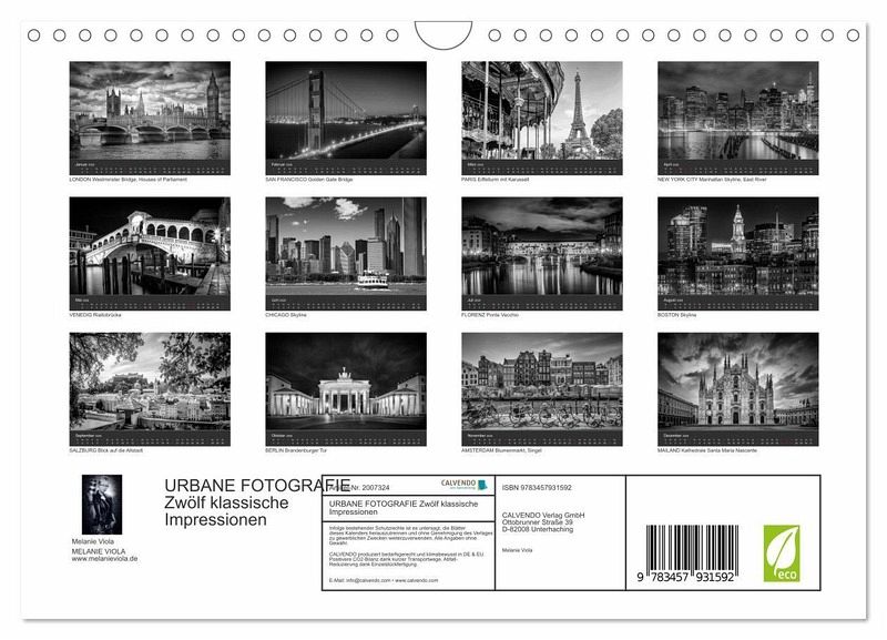 Erleben Sie den Charme weltbekannter Städte bei Tag oder Nacht. Typische Szenen, eindrucksvolle Skylines und Sehenswürdigkeiten aus Europa und den Vereinigten Staaten vereinen sich in diesem Kalender. Zwölf harmonische Schwarz-Weiß-Fotografien führen durch reizvolle Metropolen.