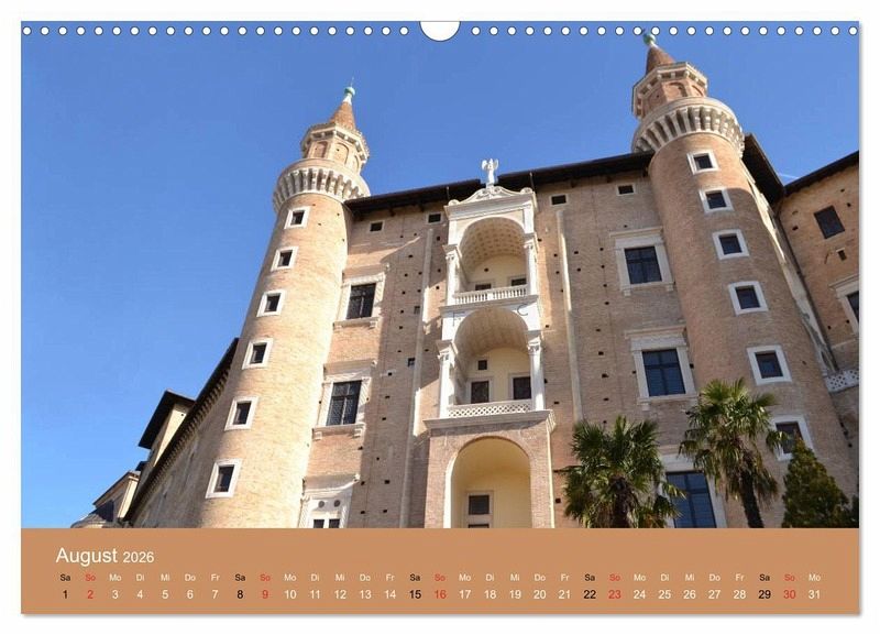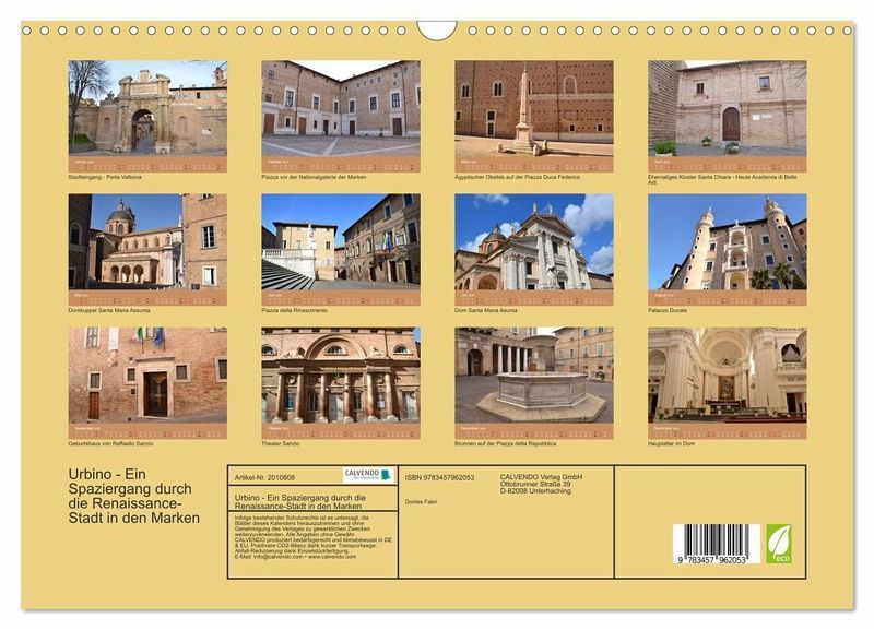 Ein kalendarischer Spaziergang durch Urbino einer Stadt in den Marken (Mittelitalien). Dank ihrer wunderbaren Kunst ist sie heute Teil des UNESCO-Weltkulturerbes. Im Palazzo Ducale befindet sich die Nationalgalerie der Marken in der Werke u. a. von Raffaello Sanzio, Piero della Francesa und Tiziano zu bewundern sind.