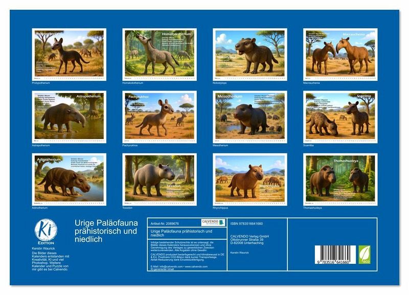 Über die ausgestorbenen Säugetiere Südamerikas ist nicht viel bekannt. Daher sind die Bilder, die man findet, auch sehr unterschiedlich. Ich habe versucht, die wichtigsten Merkmale eines jeden Tieres durch künstliche Intelligenz zum Vorschein zu bringen und gleichzeitig sollte das Ergebnis nicht gefährlich hässlich sein - sondern fröhlich und drollig. Was wissen wir schon, ob es nicht so war? Möge mein Kalender einladen, ein wenig selbst über diese Tiere zu forschen und vielleicht mehr über Paläontologie wissen zu wollen.