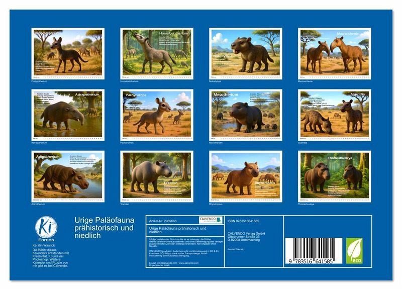 Über die ausgestorbenen Säugetiere Südamerikas ist nicht viel bekannt. Daher sind die Bilder, die man findet, auch sehr unterschiedlich. Ich habe versucht, die wichtigsten Merkmale eines jeden Tieres durch künstliche Intelligenz zum Vorschein zu bringen und gleichzeitig sollte das Ergebnis nicht gefährlich hässlich sein - sondern fröhlich und drollig. Was wissen wir schon, ob es nicht so war? Möge mein Kalender einladen, ein wenig selbst über diese Tiere zu forschen und vielleicht mehr über Paläontologie wissen zu wollen.