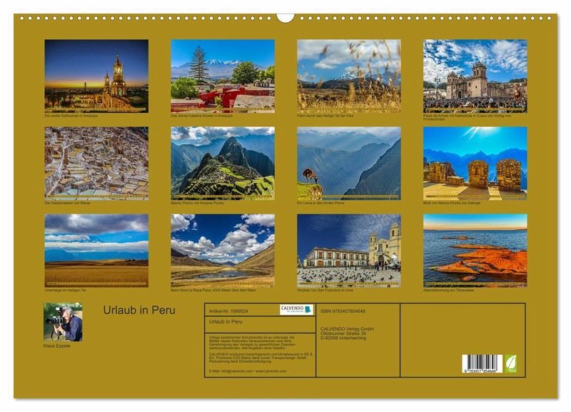 QUALITÄT - Hochwertiger Fotokalender mit 12 wunderschönen Motiven auf lichtbeständigem Bilderdruckpapier, robuste Spiralbindung mit Aufhängebügel.NACHHALTIG - deutliche Abfallreduzierung durch bedarfsgerechte Einzelstückfertigung, umweltfreundliches FSC-zertifiziertes Papier, Produktion in Deutschland, klimabewusste Logistik.PERFEKTES GESCHENK - Kalender für Freunde und Familie, für Kinder und Erwachsene, jung und alt, zu Weihnachten, Geburtstag oder zwischendurch.VIELFALT - Bildkalender in verschiedenen Formaten, z.B. DIN A5, DIN A4, DIN A3 sowie DIN A2. Ob Naturmotiv, Gemälde oder Fotos, ideal für ein persönliches Wohlfühlambiente.Faszinierende Fotografien von Peru (Lima, Arequipa, Cusco, das heilige Tal der Inka, Machu Picchu und Titicacasee) von Autor(in): Klaus Eppele
