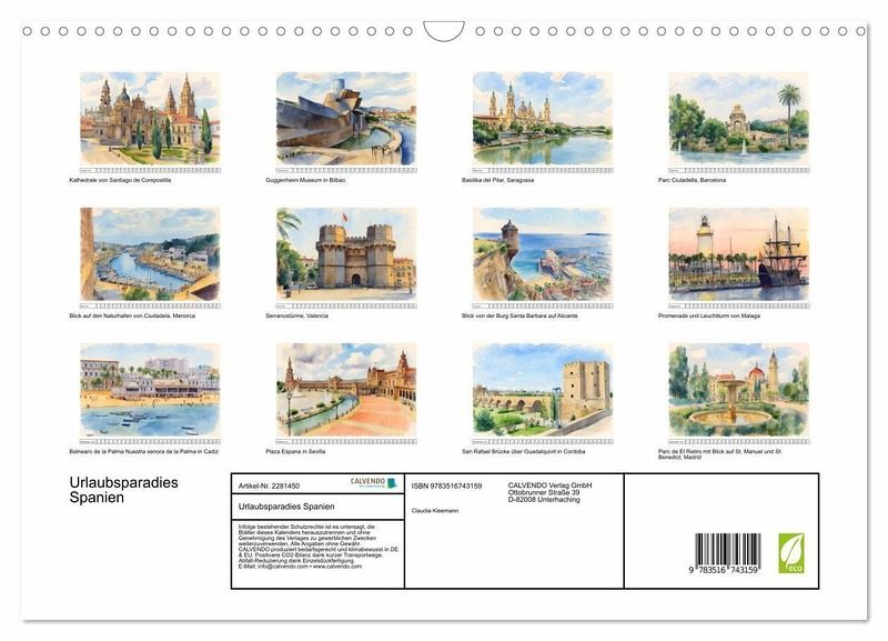Spanien ist ein lebendiges Land Südeuropas. Am Meer - dem Atlantik und dem Mittelmeer - findet man endlose Strände, die zum Badeurlaub einladen. Die Gebirge - Pyrenäen und Sierra Nevada bieten ausgedehnte Wandermöglichkeiten. Außerdem laden viele Städte mit Tradition und ihren historischen Gebäuden ein. Jede Stadt erzählt einzigartige Kapitel aus römischer, maurischer und christlicher Geschichte, die Architektur ist vielfältig vom Altertum bis in die Moderne. All diese einzigartigen Facetten werden hier im Aquarell-Stil vorgestellt, Die Bilder entstanden aus Fotos, die mithilfe moderner Bildbearbeitung umgewandelt wurden.