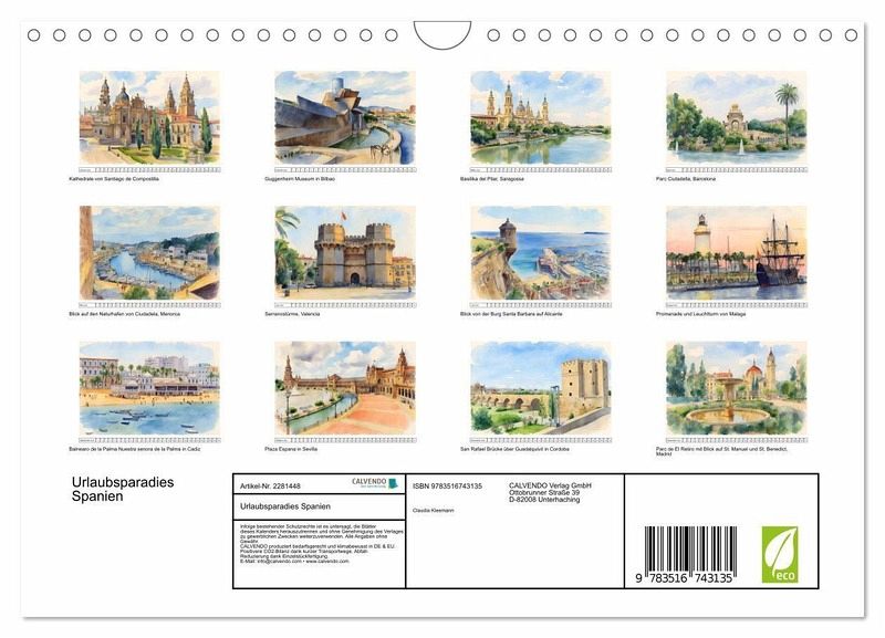 Spanien ist ein lebendiges Land Südeuropas. Am Meer - dem Atlantik und dem Mittelmeer - findet man endlose Strände, die zum Badeurlaub einladen. Die Gebirge - Pyrenäen und Sierra Nevada bieten ausgedehnte Wandermöglichkeiten. Außerdem laden viele Städte mit Tradition und ihren historischen Gebäuden ein. Jede Stadt erzählt einzigartige Kapitel aus römischer, maurischer und christlicher Geschichte, die Architektur ist vielfältig vom Altertum bis in die Moderne. All diese einzigartigen Facetten werden hier im Aquarell-Stil vorgestellt, Die Bilder entstanden aus Fotos, die mithilfe moderner Bildbearbeitung umgewandelt wurden.