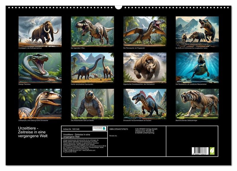 Hast du nicht schon immer davon geträumt, eine Reise in längst vergangene Zeiten zu unternehmen und all die wunderbaren Tiere zu bewundern, die heute leider ausgestorben sind? Der mithilfe von KI kreierte Kalender von Renate Utz lädt dich ein, in die geheimnisvolle Urzeit einzutauchen. Lass dich entführen in eine Welt, lange vor unserer Zeit. Beobachte jeden Monat einen anderen beeindruckenden Urzeitbewohner, vom legendären Säbelzahntiger über verschiedene Sauropoden bis hin zum gigantischen Mammut. Das perfekte Geschenk für Liebhaber urzeitlicher Tiere und Geschichtsinteressierte. Starte jetzt deine abenteuerliche Reise durch die verschiedenen Erdzeitalter!