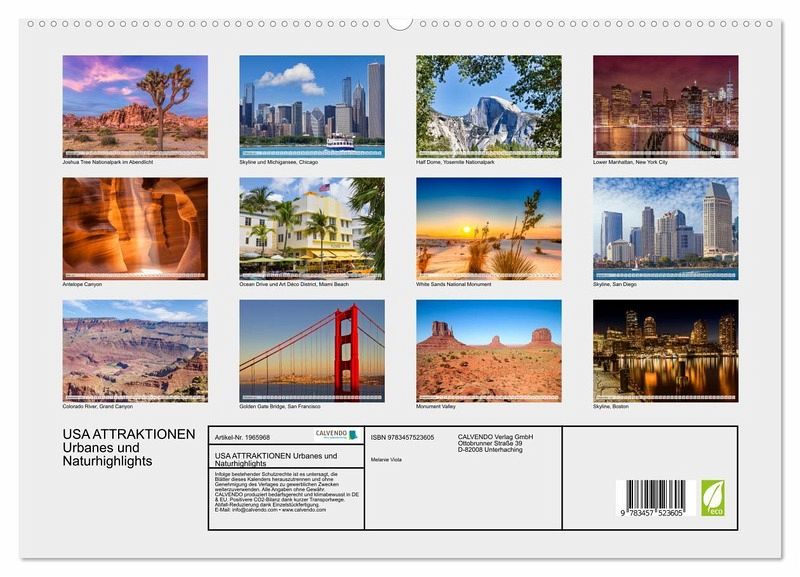 Erleben Sie den Charme weltbekannter Metropolen bei Tag oder Nacht sowie die Einzigartigkeit der abwechslungsreichen Landschaften. Markante Skylines, typische Stadtansichten sowie die Idylle und Faszination der Natursehenswürdigkeiten vereinen sich in diesem Kalender. Zwölf harmonische Fotografien zeigen einen Querschnitt durch die Vereinigten Staaten.