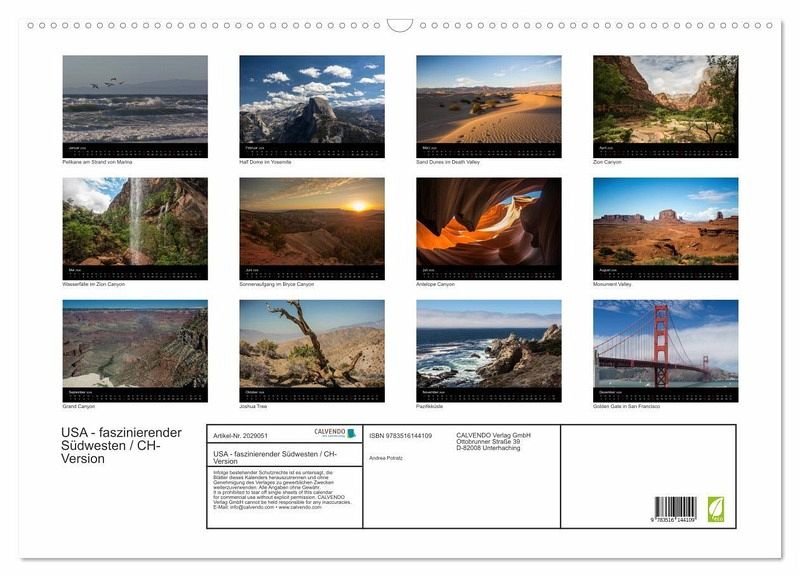 QUALITÄT - Hochwertiger Fotokalender mit 12 wunderschönen Motiven auf lichtbeständigem Bilderdruckpapier, robuste Spiralbindung mit Aufhängebügel.NACHHALTIG - deutliche Abfallreduzierung durch bedarfsgerechte Einzelstückfertigung, umweltfreundliches FSC-zertifiziertes Papier, Produktion in Deutschland, klimabewusste Logistik.PERFEKTES GESCHENK - Kalender für Freunde und Familie, für Kinder und Erwachsene, jung und alt, zu Weihnachten, Geburtstag oder zwischendurch.VIELFALT - Bildkalender in verschiedenen Formaten, z.B. DIN A5, DIN A4, DIN A3 sowie DIN A2. Ob Naturmotiv, Gemälde oder Fotos, ideal für ein persönliches Wohlfühlambiente.Faszierende Bilder aus dem Südwesten der USA vonAutor(in): Andrea Potratz.