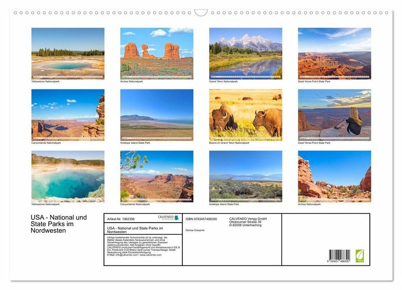 QUALITÄT - Hochwertiger Fotokalender mit 12 wunderschönen Motiven auf lichtbeständigem Bilderdruckpapier, robuste Spiralbindung mit Aufhängebügel.NACHHALTIG - deutliche Abfallreduzierung durch bedarfsgerechte Einzelstückfertigung, umweltfreundliches FSC-zertifiziertes Papier, Produktion in Deutschland, klimabewusste Logistik.PERFEKTES GESCHENK - Kalender für Freunde und Familie, für Kinder und Erwachsene, jung und alt, zu Weihnachten, Geburtstag oder zwischendurch.VIELFALT - Bildkalender in verschiedenen Formaten, z.B. DIN A5, DIN A4, DIN A3 sowie DIN A2. Ob Naturmotiv, Gemälde oder Fotos, ideal für ein persönliches Wohlfühlambiente.Ein Kalender voller atemberaubender Aufnahmen der National und State Parks im Nordwesten der USA, der die majestätische Schönheit dieser Naturwunder das ganze Jahr über einfängt. von Autor(in): Denise Graupner