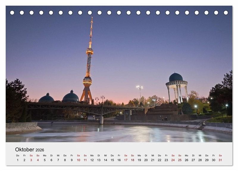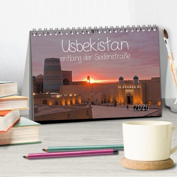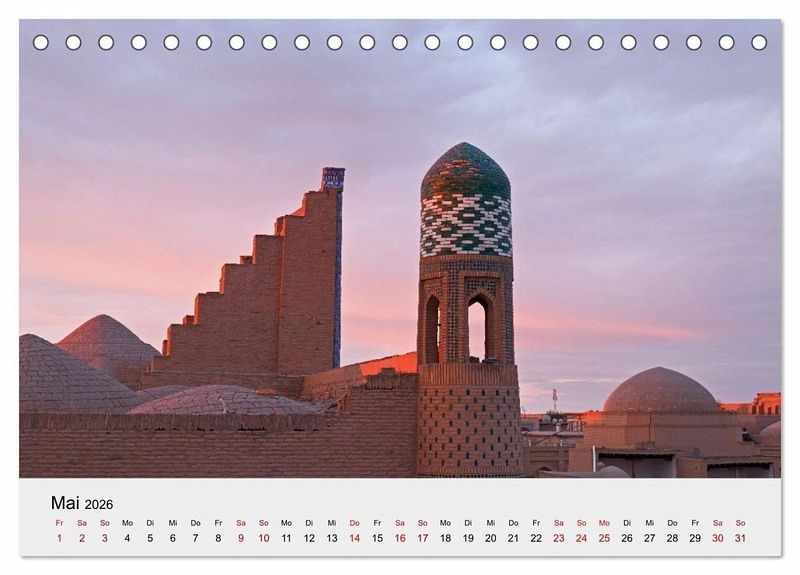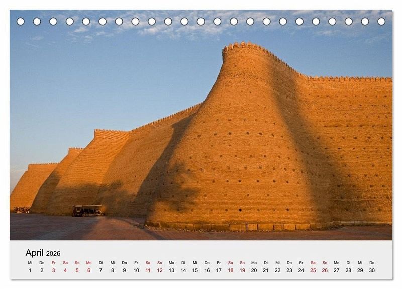 Der Kalender zeigt Usbekische Städte entlang der alten Seidenstraße mit ihrer muslimischen Architektur (Moscheen, Medresen, Minarette) und modernen Bauten von der Oasenstadt Xiva (auch Chiwa) ganz im Westen über Buchara (auch Buxara oder Buxoro) am Fluss Serafschan und dem legendären Samarkand (auch Samarqand) bis zur Hauptstadt Taschkent (auch Toschkent) an der Grenze zu Kasachstan am westlichen Rand des Tian-Shan Gebirges ganz im Osten des Landes