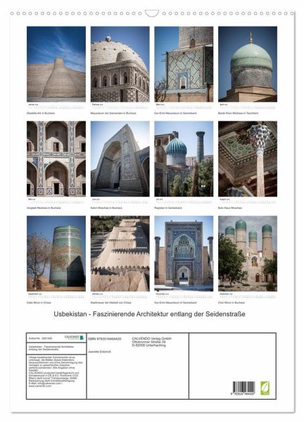 QUALITÄT - Hochwertiger Fotokalender mit 12 wunderschönen Motiven auf lichtbeständigem Bilderdruckpapier, robuste Spiralbindung mit Aufhängebügel.NACHHALTIG - deutliche Abfallreduzierung durch bedarfsgerechte Einzelstückfertigung, umweltfreundliches FSC-zertifiziertes Papier, Produktion in Deutschland, klimabewusste Logistik.PERFEKTES GESCHENK - Kalender für Freunde und Familie, für Kinder und Erwachsene, jung und alt, zu Weihnachten, Geburtstag oder zwischendurch.VIELFALT - Bildkalender in verschiedenen Formaten, z.B. DIN A5, DIN A4, DIN A3 sowie DIN A2. Ob Naturmotiv, Gemälde oderFotos, ideal für ein persönliches Wohlfühlambiente.Die faszinierende Architektur in den Städten Usbekistans entlang der alten Seidenstraße. von Autor(in): Jeanette Dobrindt