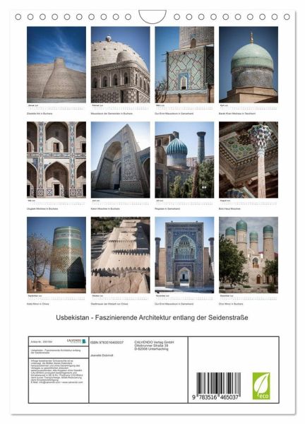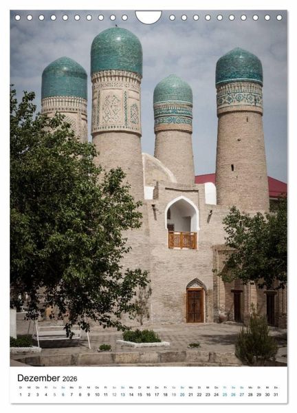 QUALITÄT - Hochwertiger Fotokalender mit 12 wunderschönen Motiven auf lichtbeständigem Bilderdruckpapier, robuste Spiralbindung mit Aufhängebügel.NACHHALTIG - deutliche Abfallreduzierung durch bedarfsgerechte Einzelstückfertigung, umweltfreundliches FSC-zertifiziertes Papier, Produktion in Deutschland, klimabewusste Logistik.PERFEKTES GESCHENK - Kalender für Freunde und Familie, für Kinder und Erwachsene, jung und alt, zu Weihnachten, Geburtstag oder zwischendurch.VIELFALT - Bildkalender in verschiedenen Formaten, z.B. DIN A5, DIN A4, DIN A3 sowie DIN A2. Ob Naturmotiv, Gemälde oderFotos, ideal für ein persönliches Wohlfühlambiente.Die faszinierende Architektur in den Städten Usbekistans entlang der alten Seidenstraße. von Autor(in): Jeanette Dobrindt