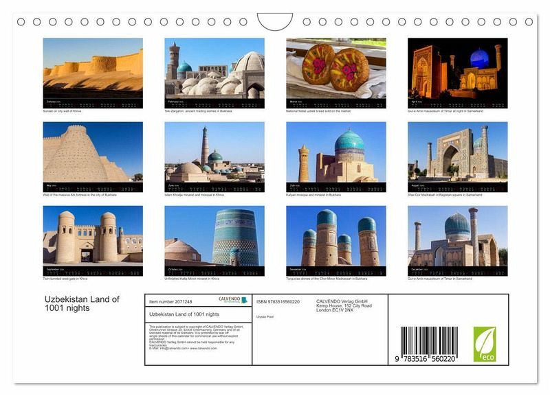 QUALITY - High-quality photo calendar with 12 beautiful images on light-resistant paper, robust spiral binding with hanger.SUSTAINABLE - Significant waste reduction due to print-on-demand production, environmentally friendly FSC-certified paper, produced in the UK, climate-conscious logistical processes.PERFECT GIFT - calendars for friends and family, for children, all ages and all occasions, from Christmas to birthdays and everything in between.LOTS OF CHOICE - Wall calendars in different sizes (DIN A4 and DIN A3), for any topic and personal taste, featuring photography, painting and illustrations.A selection of beautiful photographs from Uzbekistan, author: UlyssePixel