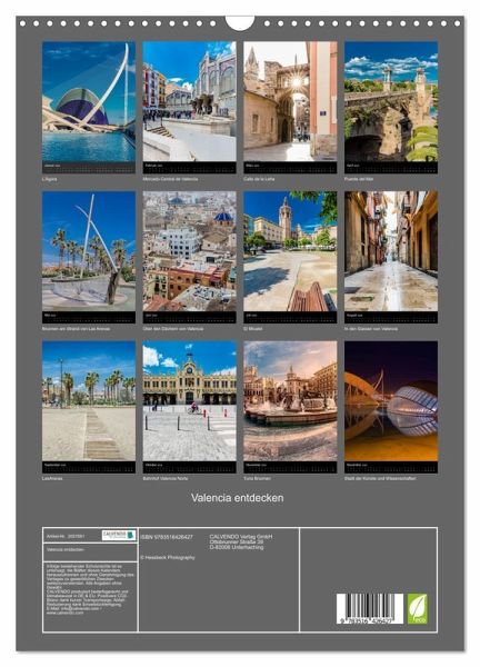 QUALITÄT - Hochwertiger Fotokalender mit 12 wunderschönen Motiven auf lichtbeständigem Bilderdruckpapier, robuste Spiralbindung mit Aufhängebügel.NACHHALTIG - deutliche Abfallreduzierung durch bedarfsgerechte Einzelstückfertigung, umweltfreundliches FSC-zertifiziertes Papier, Produktion in Deutschland, klimabewusste Logistik.PERFEKTES GESCHENK - Kalender für Freunde und Familie, für Kinder und Erwachsene, jung und alt, zu Weihnachten, Geburtstag oder zwischendurch.VIELFALT - Bildkalender in verschiedenen Formaten, z.B. DIN A5, DIN A4, DIN A3 sowie DIN A2. Ob Naturmotiv, Gemälde oder Fotos, ideal für ein persönliches Wohlfühlambiente.Begeben Sie sich auf Entdeckungsreise durch Valencia von Autor(in): Stefan Becker