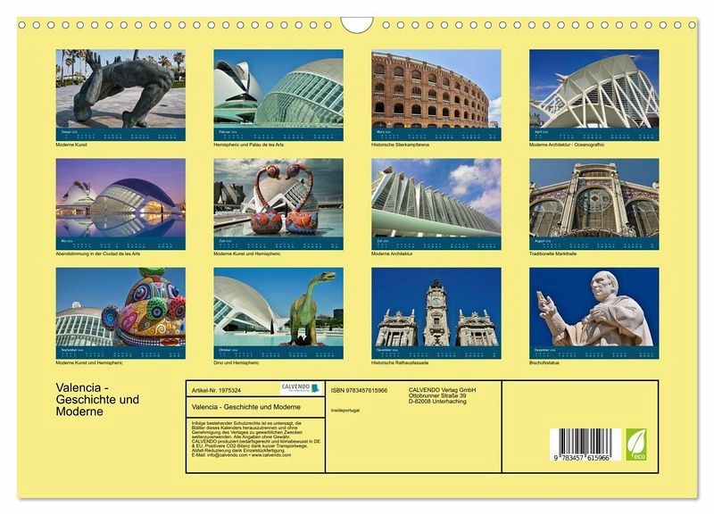 Valencia ist eine Mischung aus Geschichte und Zukunft. Wir finden atemberaubende moderne Architektur neben historischen Bauwerken, eingerahmt in Kunst der Gegenwart. Eine moderne Grossstadt mit Geschichte. Dieser Kalender zeigt Ihnen die interessantesten Aufnahmen unseres Portfolios