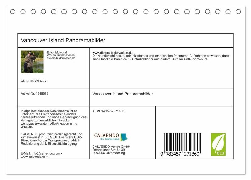 Die Serie "CanadaExtraWide" ist eine besondere Kalenderserie mit ausdrucksstarken Panoramabildern verschiedener kanadischer Regionen. Dieter-M. Wilczek - Erlebnisfotograf und naturverbunden - ist der Faszination der wunderschönen Insel Vancouver Island erlegen. Von Gebirgszügen im Zentrum der Insel, über Sandstrände, felsige Steilküsten, Bären- und Walbeobachtungen bis hin zum britischem Flair von Victoria - mit seinen Aufnahmen hat er die Besonderheiten und die landschaftliche Vielfalt in seinen Fotos eingefangen.