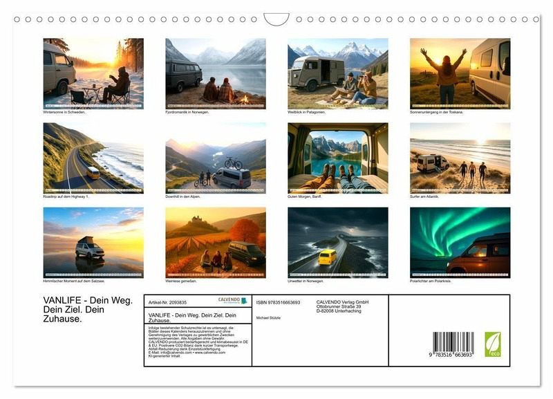 Träumen Sie von der Freiheit auf vier Rädern? Holen Sie sich das Gefühl der Unabhängigkeit mit diesem einzigartigen KI-generierten Vanlife-Kalender direkt nach Hause. Dieser Kalender ist mehr als nur ein praktischer Begleiter für das Jahr - er ist eine Hommage an die Lust am Entdecken und die Schönheit des Reisens abseits ausgetretener Pfade.