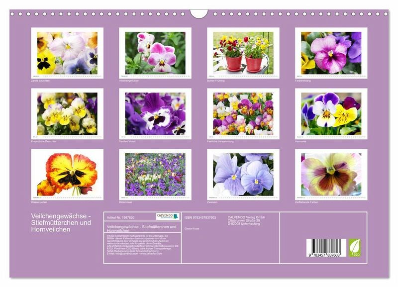 Die bekanntesten und beliebtesten Gartenveilchen sind Stiefmütterchen und Hornveilchen. Schon früh im Jahr sorgen diese liebenswerten Pflanzen für Farbe. Ihre Blüten sind mehrfarbig und oft meint man, ein zerknautscht-lustiges Gesicht zu erkennen. Dieser Kalender erfreut Sie mit einem Potpourri von Blütengesichtern und bereichert Sie ein volles Jahr.