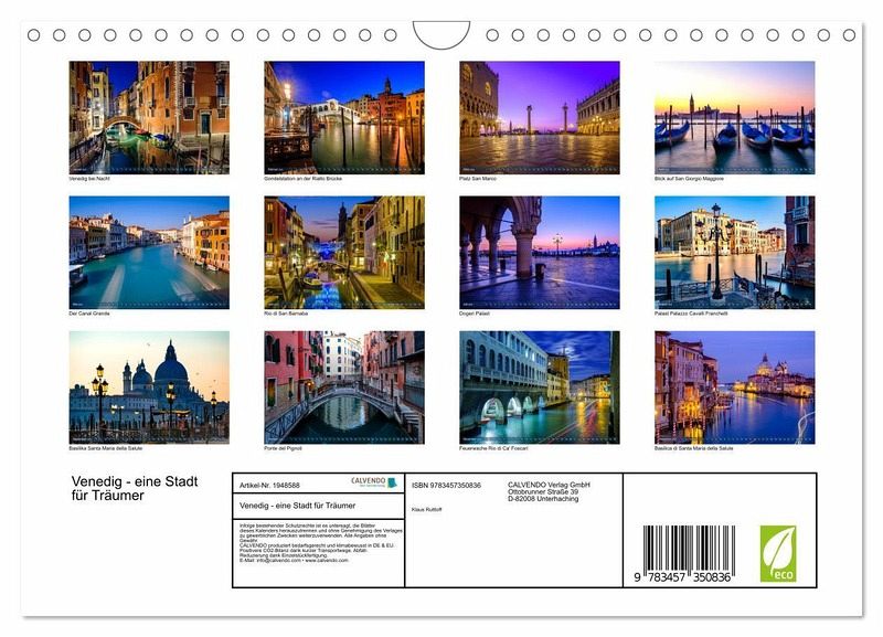 QUALITÄT - Hochwertiger Fotokalender mit 12 wunderschönen Motiven auf lichtbeständigem Bilderdruckpapier, robuste Spiralbindung mit Aufhängebügel.NACHHALTIG - deutliche Abfallreduzierung durch bedarfsgerechte Einzelstückfertigung, umweltfreundliches FSC-zertifiziertes Papier, Produktion in Deutschland, klimabewusste Logistik.PERFEKTES GESCHENK - Kalender für Freunde und Familie, für Kinder und Erwachsene, jung und alt, zu Weihnachten, Geburtstag oder zwischendurch.VIELFALT - Bildkalender in verschiedenen Formaten, z.B. DIN A5, DIN A4, DIN A3 sowie DIN A2. Ob Naturmotiv, Gemälde oder Fotos, ideal für ein persönliches Wohlfühlambiente.Venedig, die einzigartige Lagunenstadt, besticht durch ihre romantischen Kanäle und beeindruckende Architektur. von Autor(in): Klaus Ruttloff