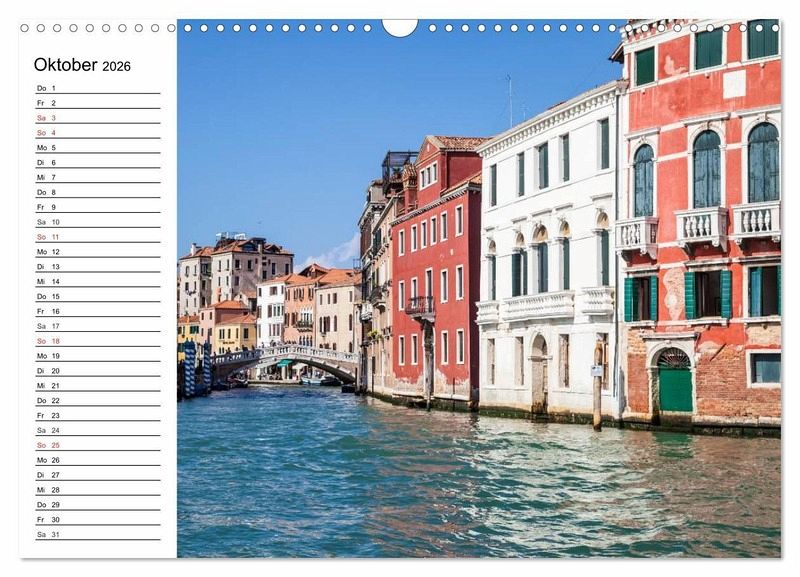 Venedig ist eine der romantischsten Städte der Welt, mit schmalen Gassen und Kanälen, luxuriösen Palästen und prachtvollen Kirchen, die alle seit Jahrhunderten unverändert sind. Mit einer Fahrt auf dem Canal Grande gewinnt man einen guten Eindruck über das Flair der Stadt und dessen Gebäude. Erleben Sie mit diesem Terminkalender die reizvolle Stadt Venedig vom Wasser aus in 13 herrlichen Motiven.