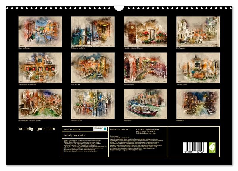 Wer die traumhafte Stadt ohne die Touristenmassen erleben will, findet dieses gemütliche Venedig nur wenige Gehminuten vom Markusplatz entfernt. Einfach in die originären Stadtteile Castello, Dorsoduro oder Cannaregio schlendern und schon befindet man sich dort, wo noch Hausfrauen in kleinen Läden einkaufen und Wäsche an den Leinen zwischen den Häusern trocknet. Für diesen Kalender hat der Fotokünstler Peter Roder zwölf wunderschöne Aufnahmen dieser einzigartigen Stadt gestaltet, ein farbenprächtiger Hingucker für das ganze Jahr.