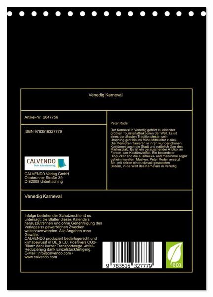 QUALITÄT - Hochwertiger Fotokalender mit 12 wunderschönen Motiven auf lichtbeständigem Bilderdruckpapier, robuste Spiralbindung.NACHHALTIG - deutliche Abfallreduzierung durch bedarfsgerechte Einzelstückfertigung, umweltfreundliches FSC-zertifiziertes Papier, Produktion in Deutschland, klimabewusste Logistik.PERFEKTES GESCHENK - Kalender für Freunde und Familie, für Kinder und Erwachsene, jung und alt, zu Weihnachten, Geburtstag oder zwischendurch.VIELFALT - Bildkalender in verschiedenen Formaten, z.B. DIN A5, DIN A4, DIN A3 sowie DIN A2. Ob Naturmotiv, Gemälde oder Fotos, ideal für ein persönliches Wohlfühlambiente.Faszination Karneval in Venedig von Autor(in): Peter Roder